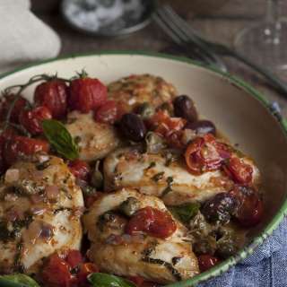 Lightly roasted chicken breasts with a tomato, olive and caper salsa