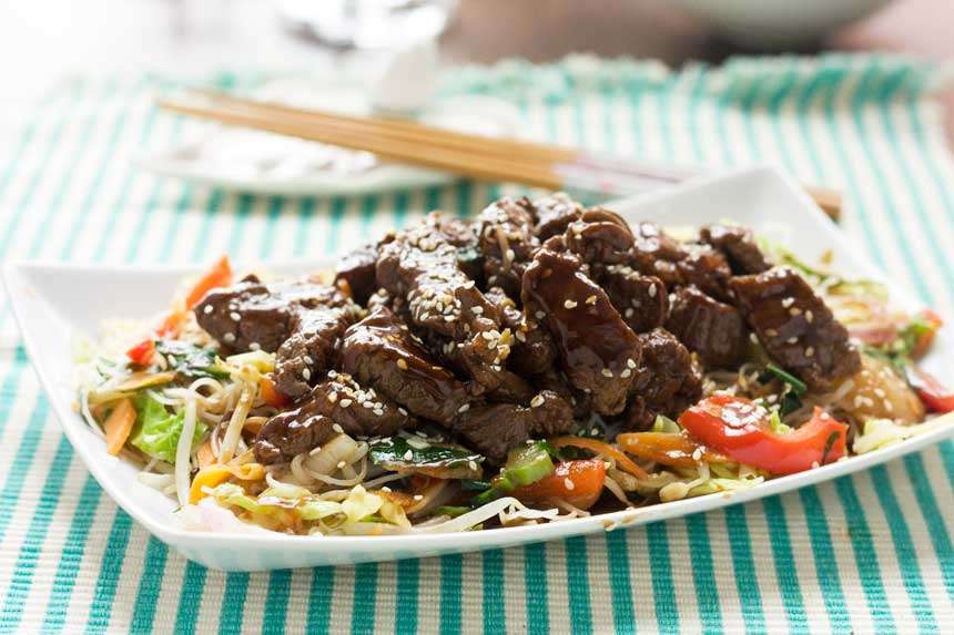 - Serve the noodles and veggies out into bowls, then top with the beef and sauce. Sprinkle the beef generously with sesame seeds and serve a little more sauce on the side if you like (see note below).