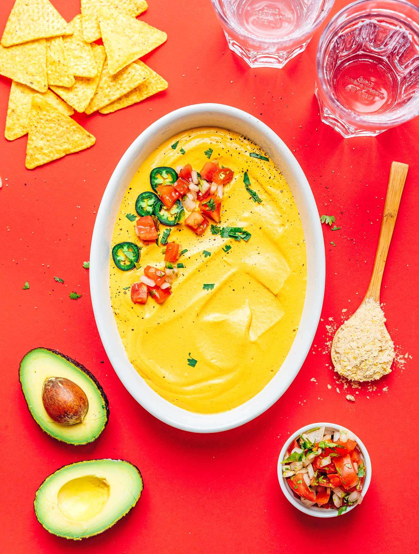 With only 9 easy-to-find ingredients, this vegan queso recipe is creamy, dreamy, and ridiculously delicious. Ready in just 10 minutes, it's the perfect last-minute topping for all your nacho, burrito, and taco needs.