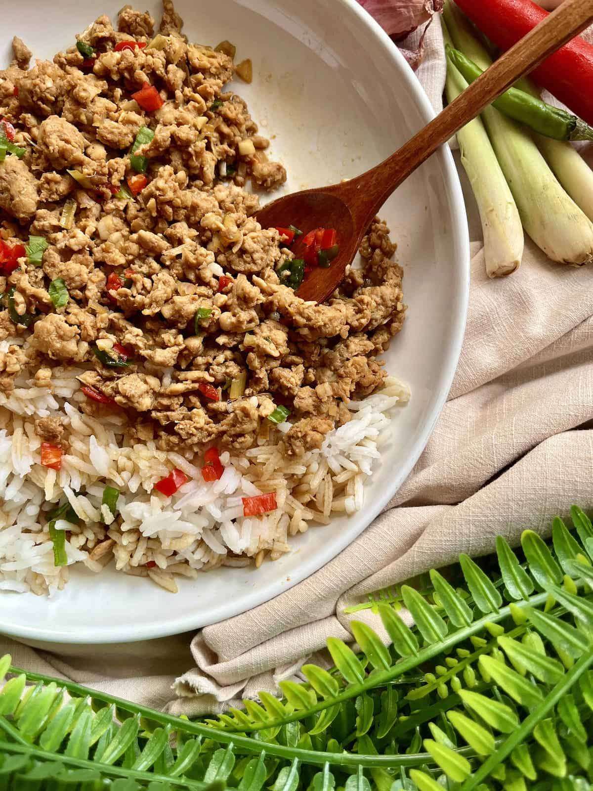 This is a QUICK and EASY stir-fried lemongrass chicken. By substituting the typical chicken thigh used for ground chicken mince, the cooking time is reduced to 10 minutes AND the cost of the recipe goes down BUT it's still super tasty!
