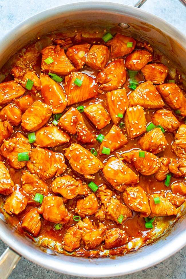- Remove pan from the heat, add the green onions, sesame seeds, and serve immediately. Chicken is best warm and fresh but will keep for up to 5 days in the fridge.