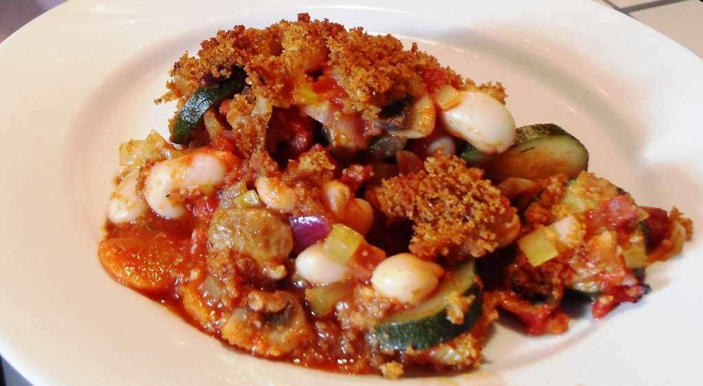 - Serve with a warm crusty wholemeal baguette. To make this dish vegetarian, simply omit the chorizo. As an alternative you could use 3 thick slices of bacon (chopped), fry well first then spread over the bottom of the dish ready to be topped with the vegetables and beans.
