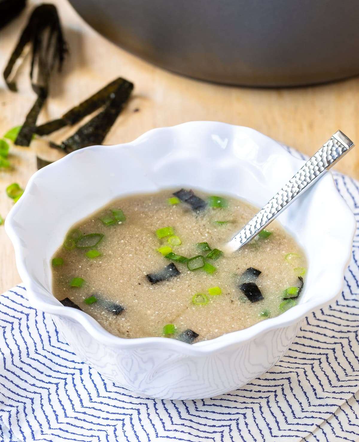 - Once the broth reaches a boil, turn off the heat and whisk in the miso paste. Once dissolved, add the tofu, nori, and green onions. Stir and serve.