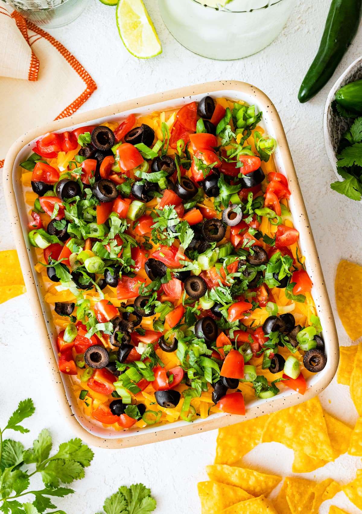 - Sprinkle evenly with shredded cheese. Top with tomatoes, black olives, green onions, and cilantro.