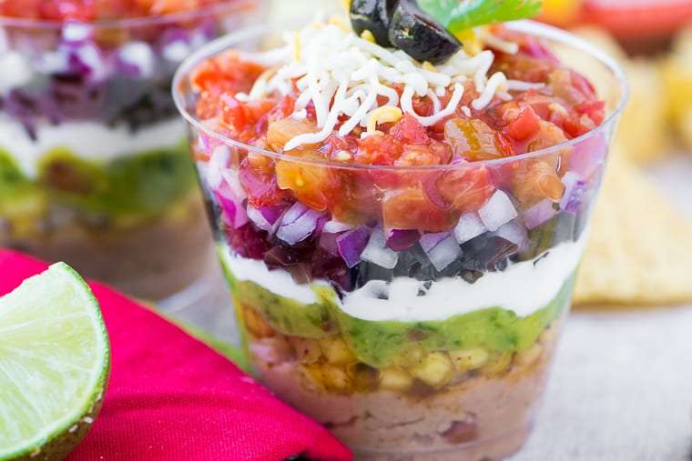 7 Layer Dip Cups ~ portable appetizers layered up like everybody's favorite Tex-Mex bean dip ~ perfect for Cinco de Mayo, picnics, barbecues!