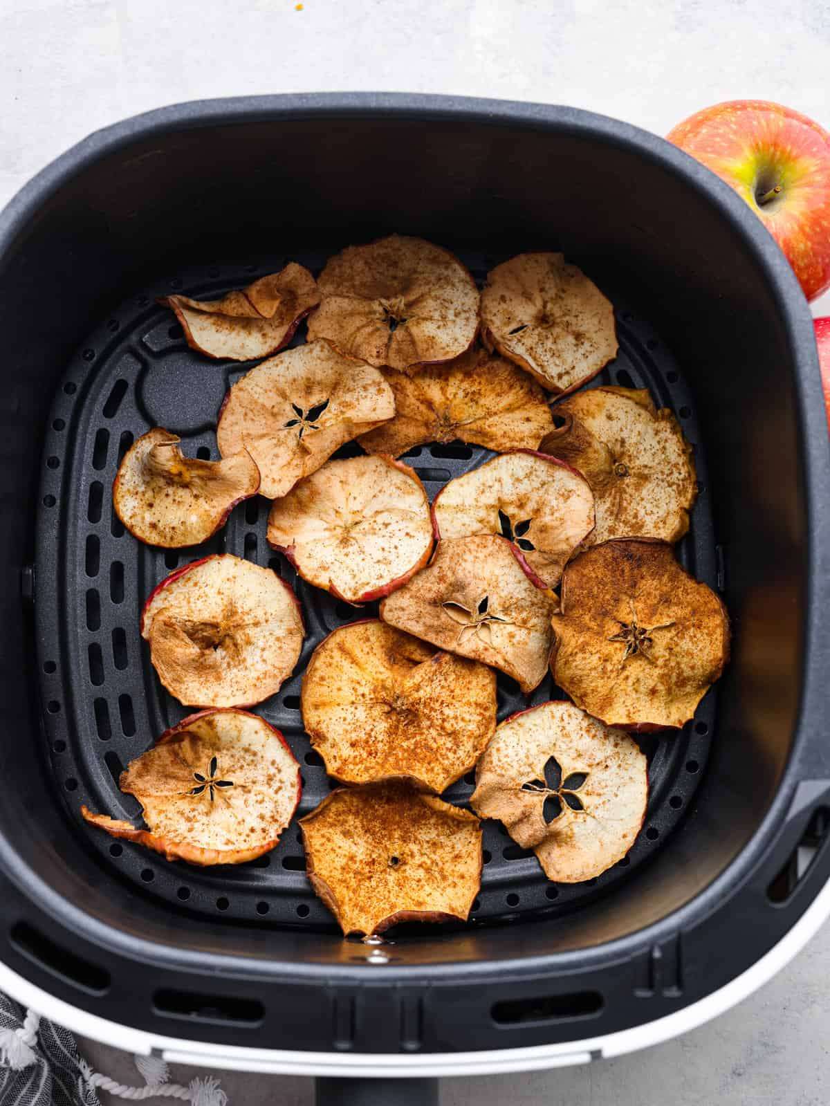 - Layer the apple slices in the air fryer basket in a single layer. Set the temperate to 300° Fahrenheit and cook for 10 minutes. Flip the apple slices halfway through, and continue to cook until the slices are crispy. Check frequently because they will cook quickly once they are flipped.