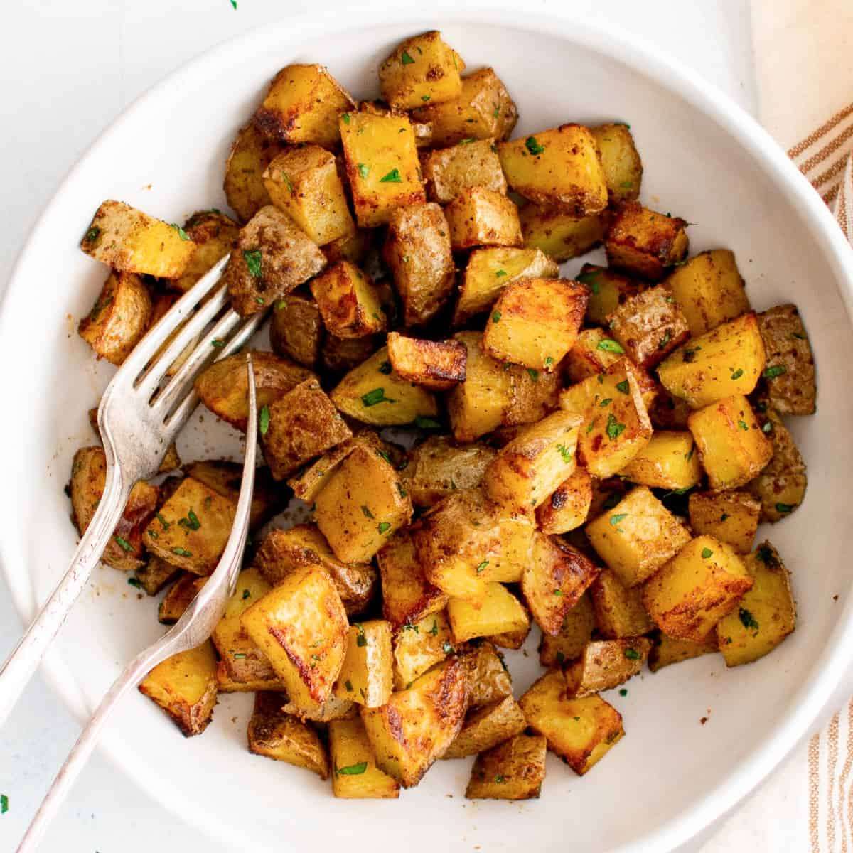 - Air fry for 15-20 minutes, shaking the basket halfway through the cooking time. Cooking time may vary depending on the size of the potato cubes and the air fryer model, so keep an eye on them to prevent burning!