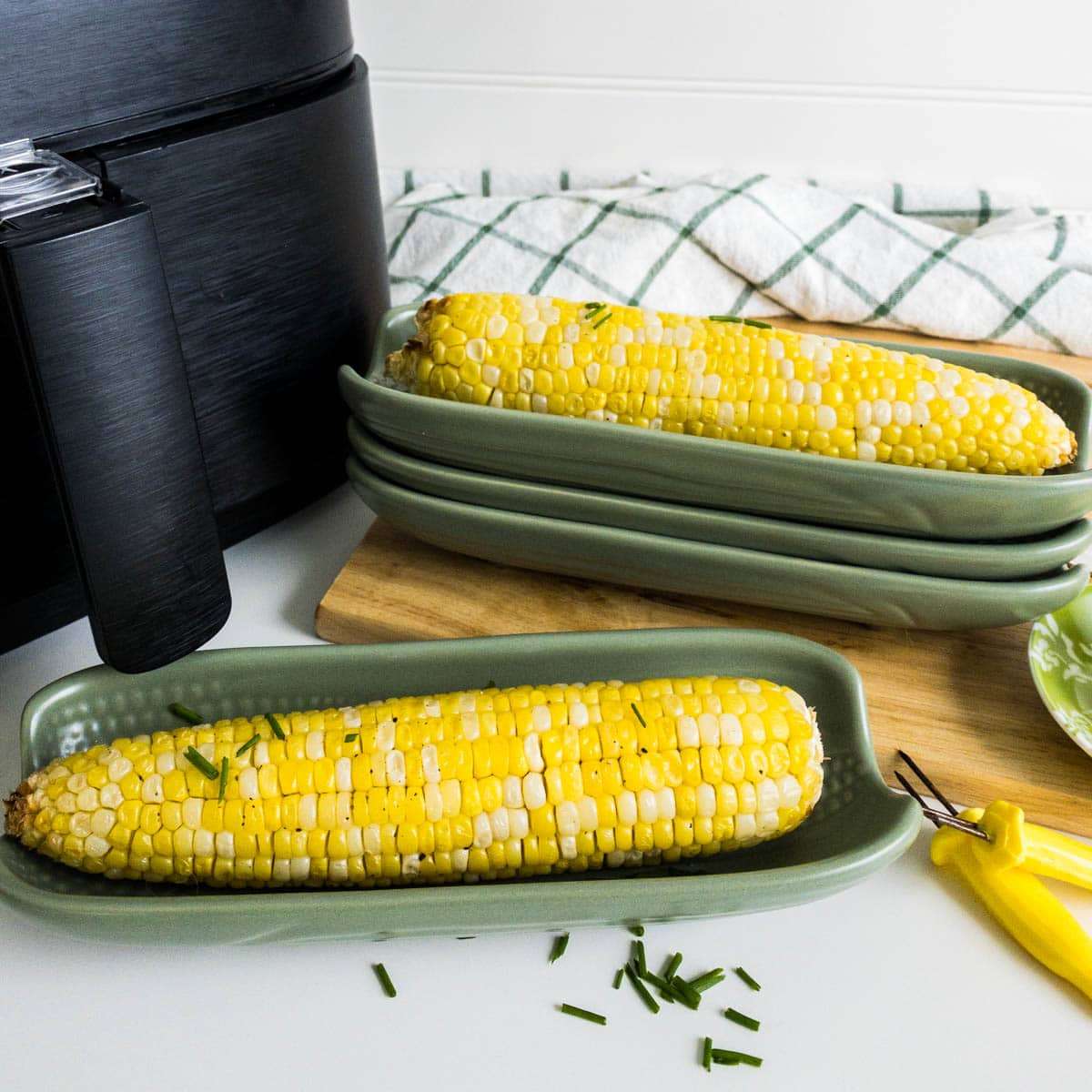 - Air fry at 400 degrees F for another 5 minutes. Check to see if the corn is done by sticking a kernel with a sharp knife or fork. If it goes in easily the corn is done. If not cook it for another 2 minutes and check again.