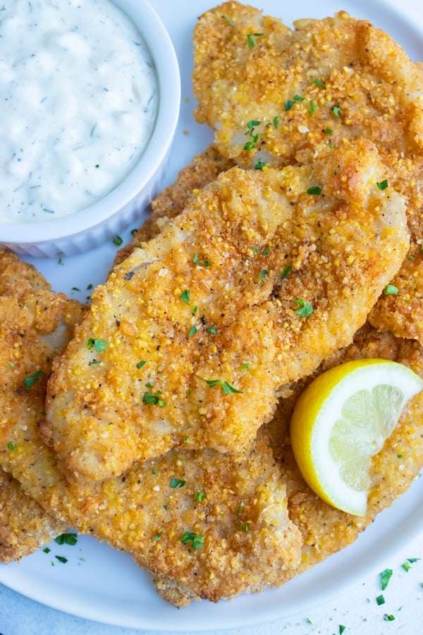 - Coat the Fish: Mix together cornmeal, flour, Cajun seasoning, paprika, garlic powder, salt, and black pepper in a medium-sized shallow bowl. Dip each filet into the cornmeal mixture and coat all sides.