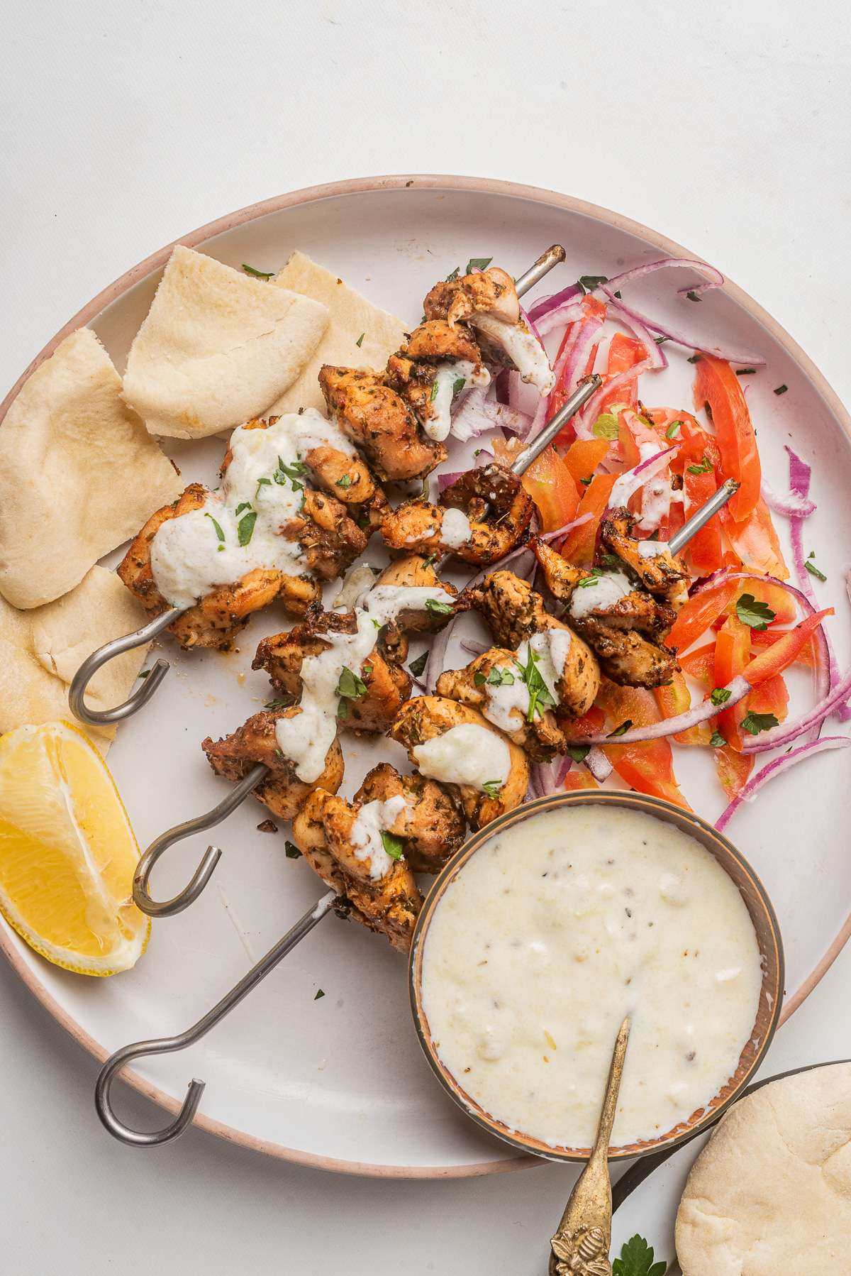 - Don’t crowd the chicken in the air fryer. Good air circulation equals perfectly cooked souvlaki.