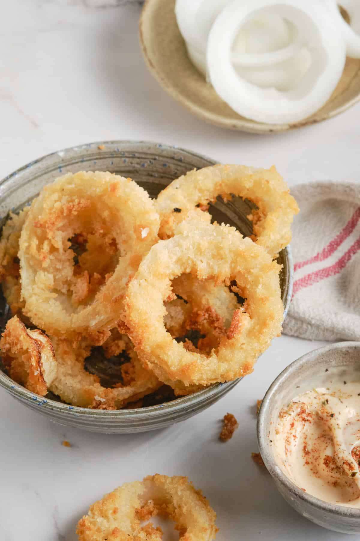 - From the egg whites, then dip the onion rings in the breading mixture. Place the breaded onion rings in the air fryer and spray with the nonstick spray. Air fry the onion rings for 5 minutes until golden brown. Remove the onions from the air fryer and transfer them to a plate. Serve with a dip of your choice!