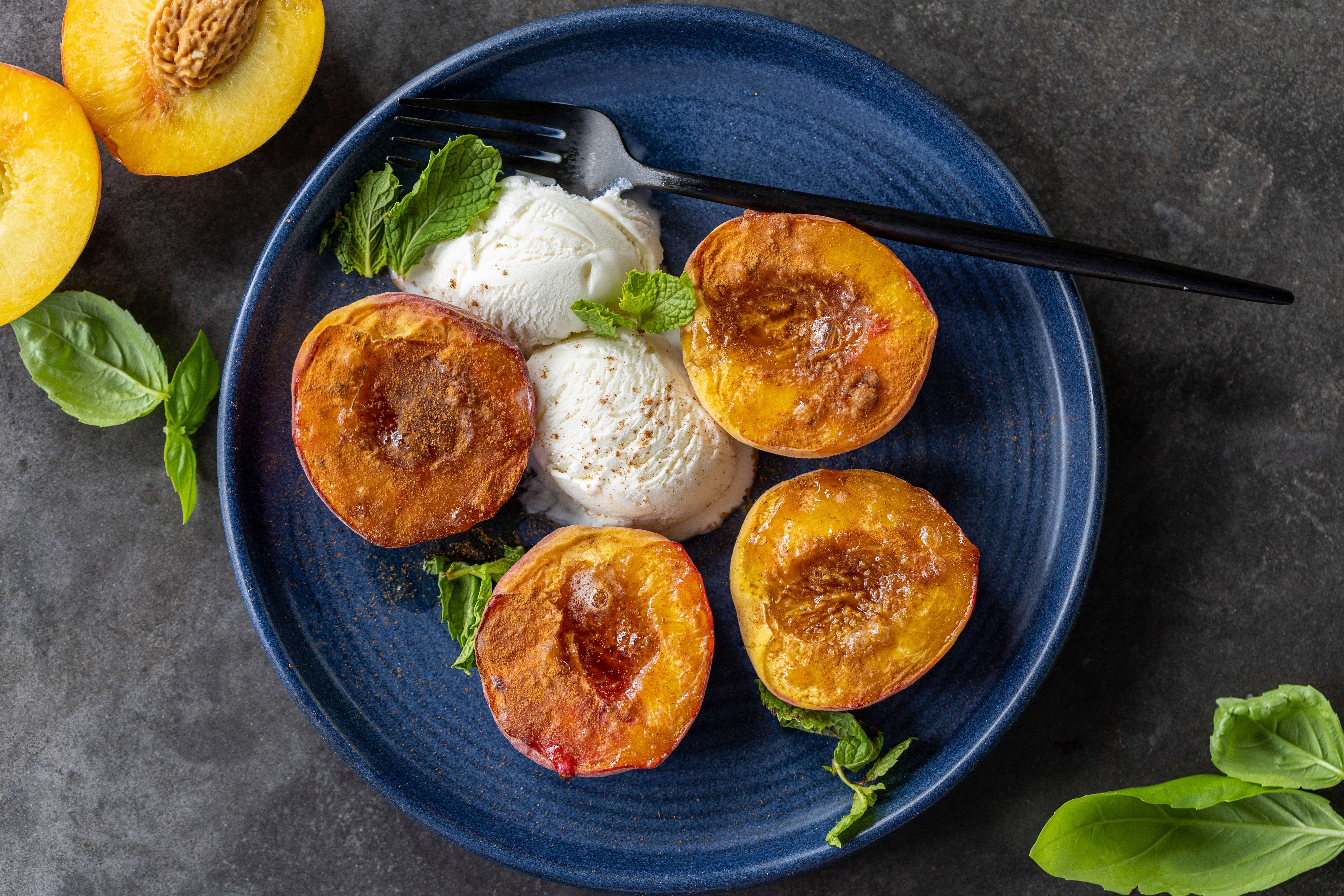 - Preheat the air fryer to 350°F. Place the peaches skin side down on the tray and cook for 8-10 minutes, or until the flesh is fork-tender and the sugar mixture has slightly caramelized.