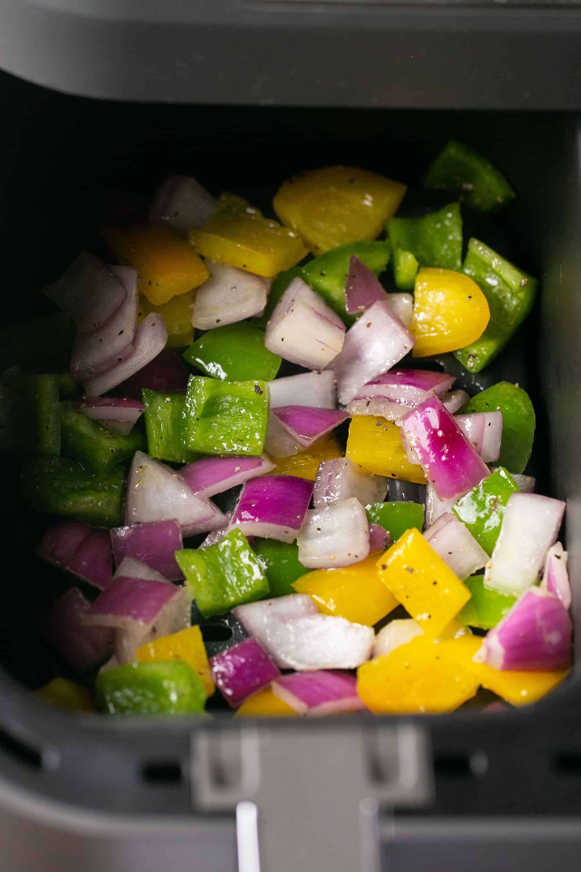 - Spray the air fryer basket and place the peppers and onions inside. Air fry for 15-17 minutes, tossing half way through, to ensure they cook evenly.