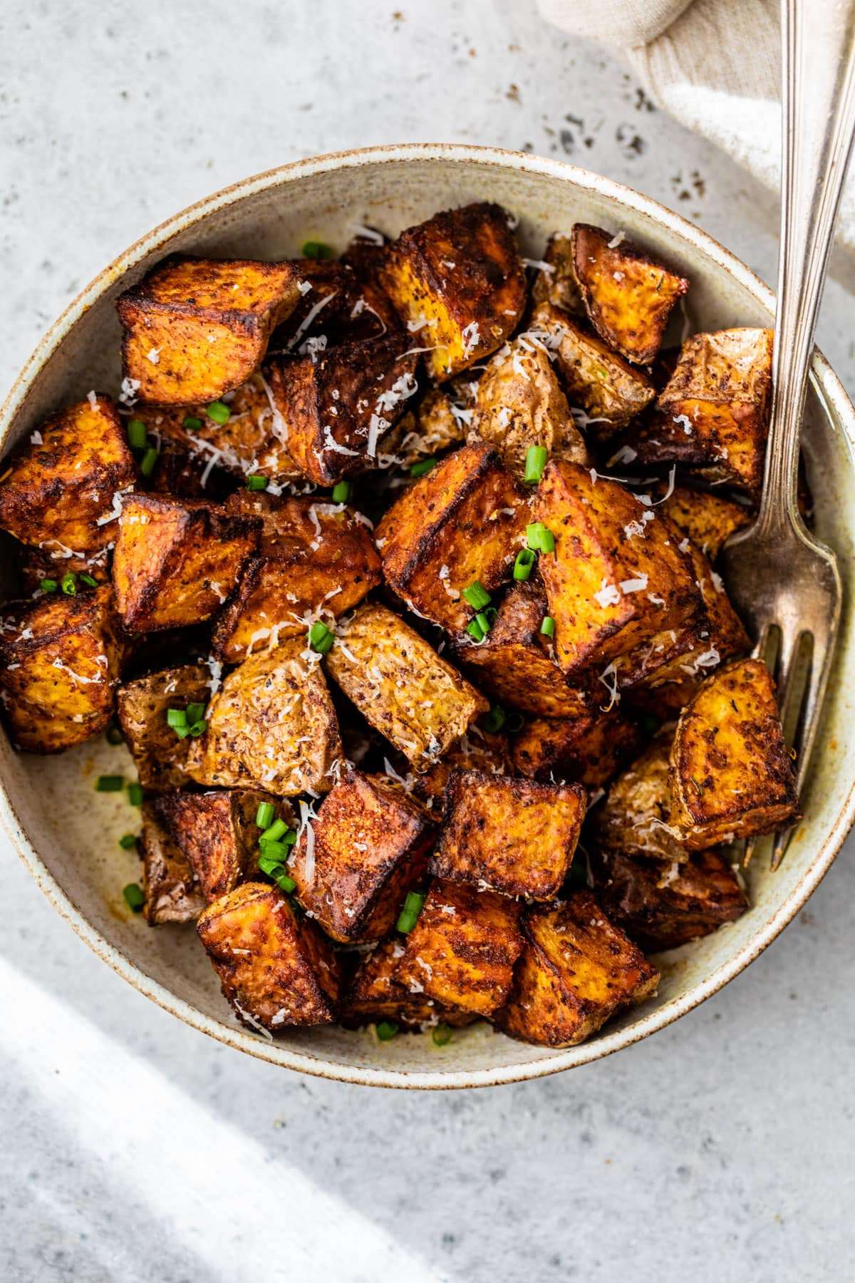 Air fryer potatoes are perfectly seasoned, tender on the inside, and crispy on the outside. Quick, easy and your new favorite side dish!
