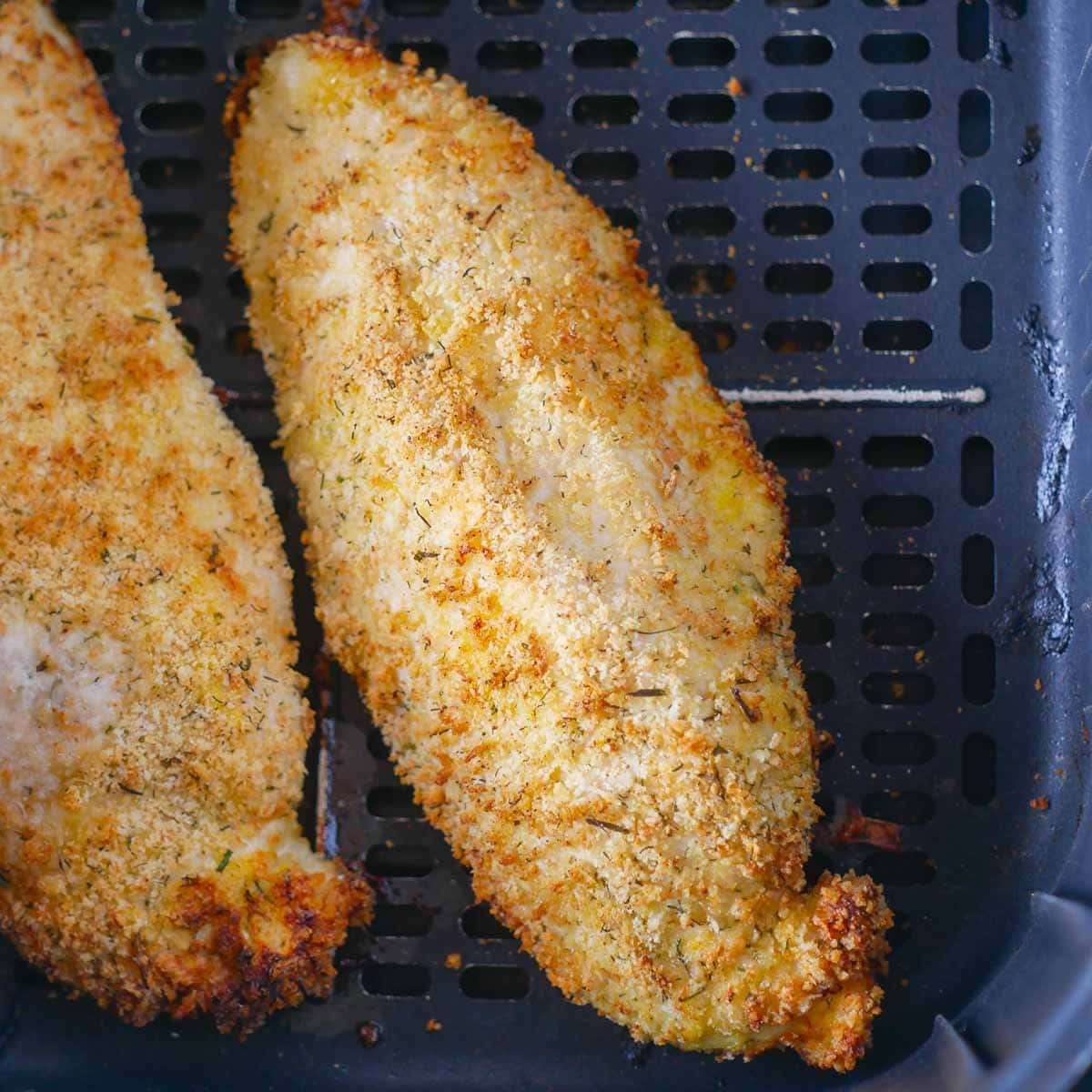Make crispy, juicy air fryer ranch chicken with this quick and easy recipe. This dish features tender chicken breasts coated in a Parmesan cheese and ranch seasoning mix.