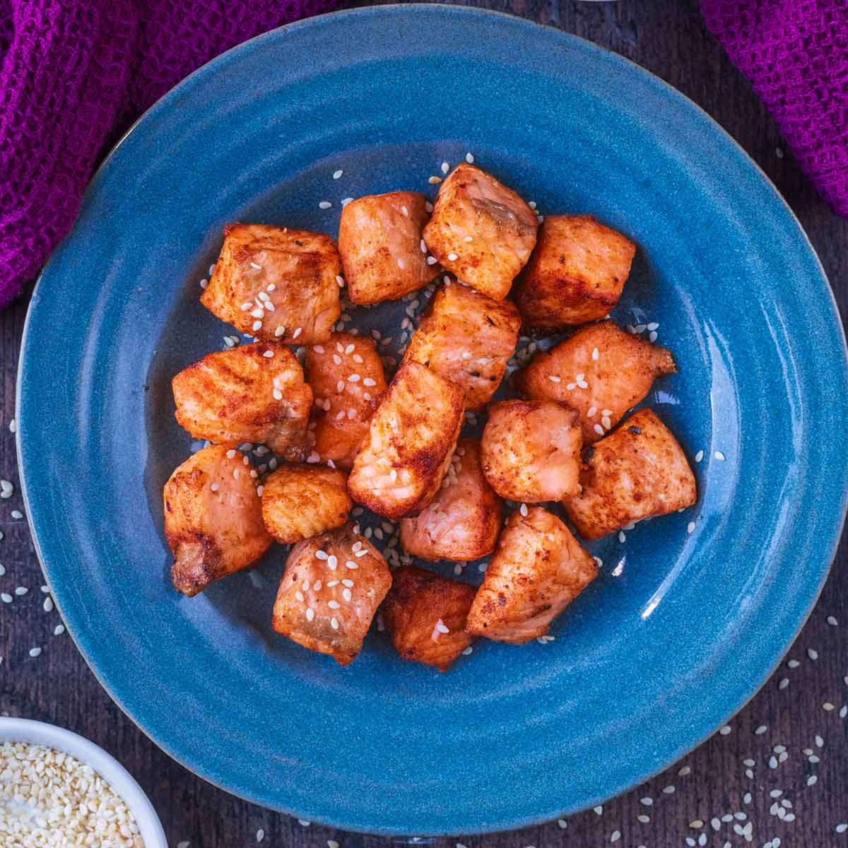 - Make sure that the salmon cubes are in a single layer and not overlapping to ensure even cooking and that the air can circulate and get them nice and crispy.