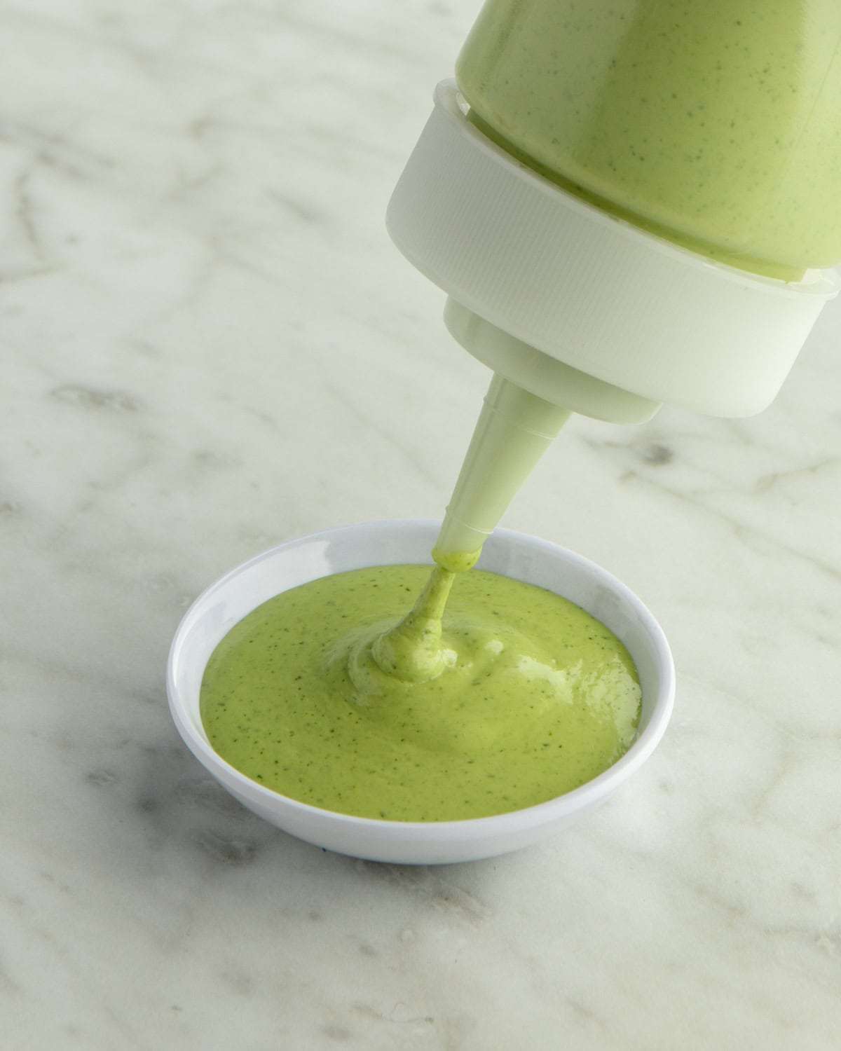Aji Verde is a Peruvian green hot sauce. It's made up of fresh cilantro, aji amarillo, huacatay and cheese that makes it creamy and spicy. Typically served alongisde pollo a la brasa, it pairs well with roasted vegetables, chicken or bread.