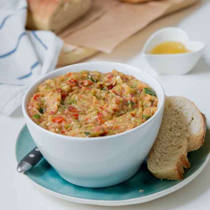 - Dans un saladier, écraser en purée les courgettes, l’ail et le poivron cuits à l’aide d’un presse purée ou d’une fourchette.