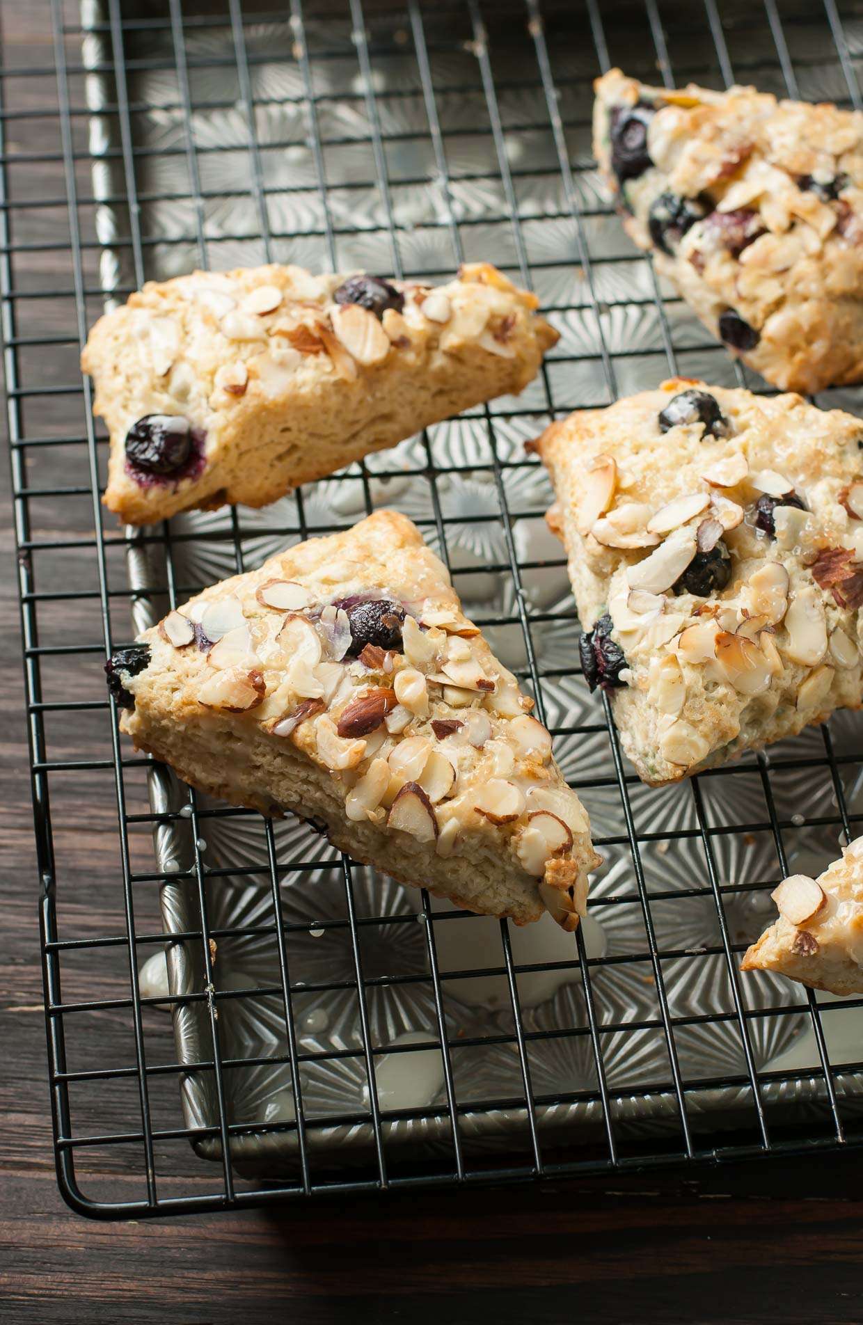 Fluffy, bakery-style almond blueberry scones with a sweet honey-lemon glaze.
