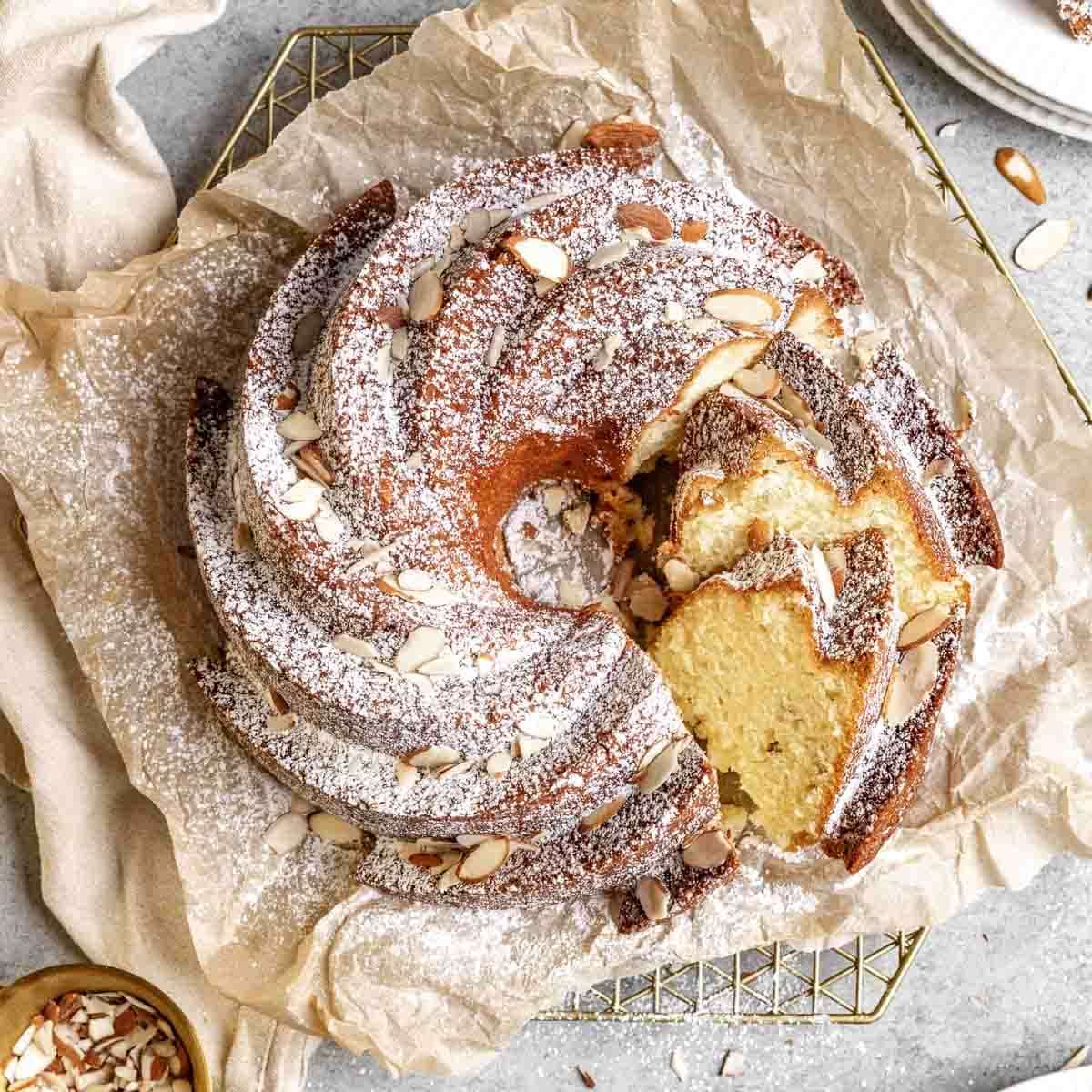 Almond Bundt Cake is an easy, moist pound cake filled with almond flavor from almond extract, sliced almonds and dusted with powdered sugar.
