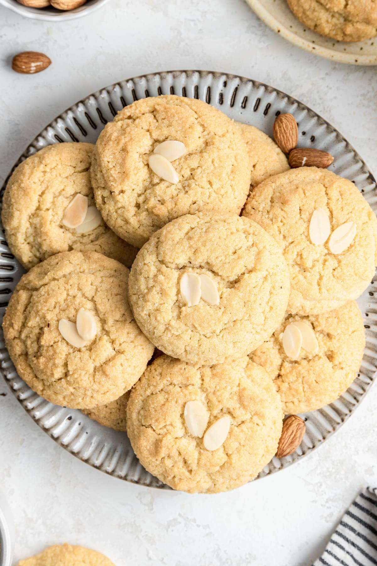 These almond cookies are made with almond flour, almond extract and topped with sliced almonds. They're buttery, soft and melt in your mouth delicious. Gluten-free + grain-free.