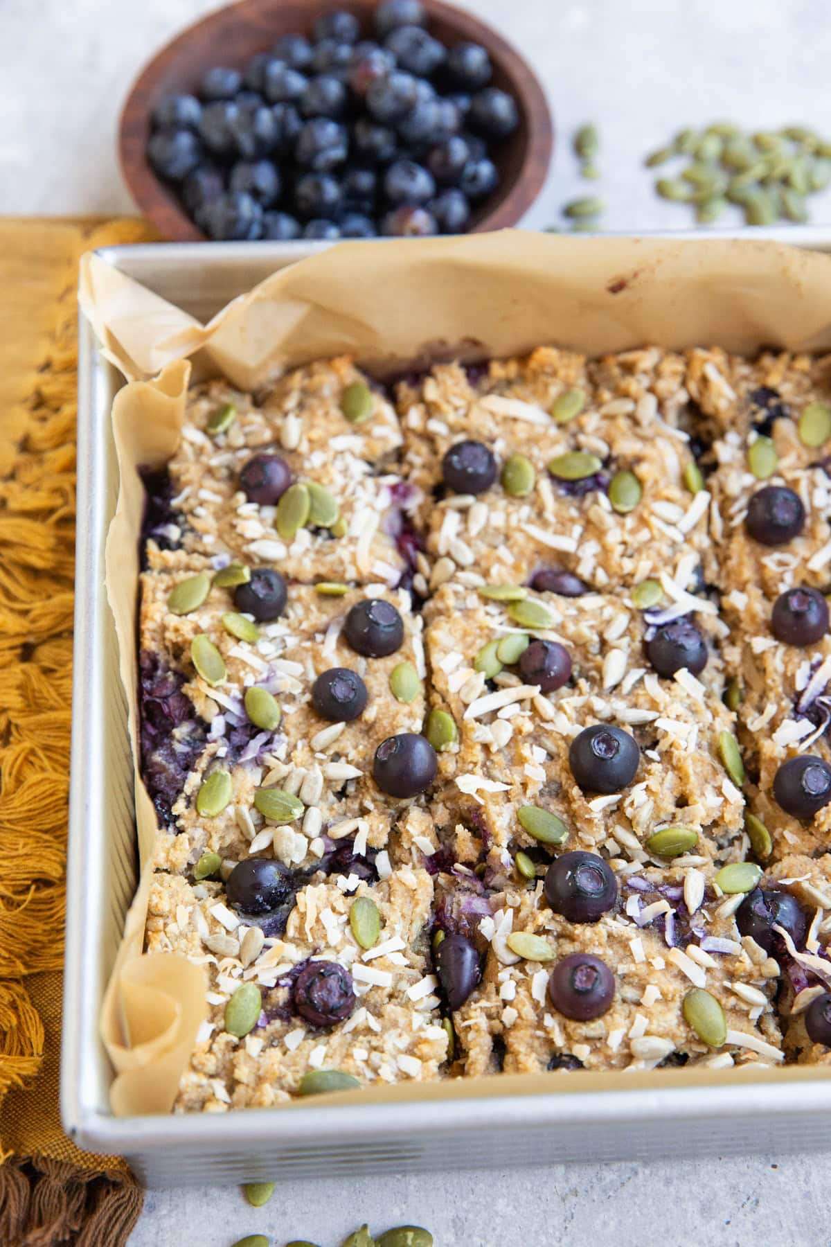 - Transfer the breakfast bar mixture to the prepared pan and use a rubber spatula or spoon to spread it into an even layer. If you’d like, press extra blueberries, shredded coconut, and/or nuts and seeds into the top of the dough. I like doing this because it’s pretty!