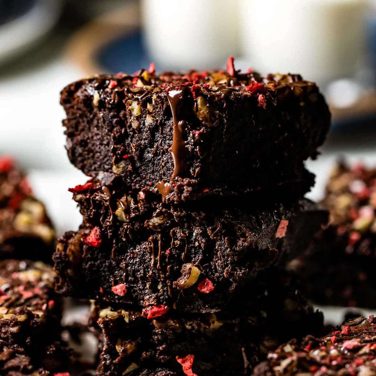 - Drizzle the melted chocolate over the brownie and sprinkle with dried strawberries.