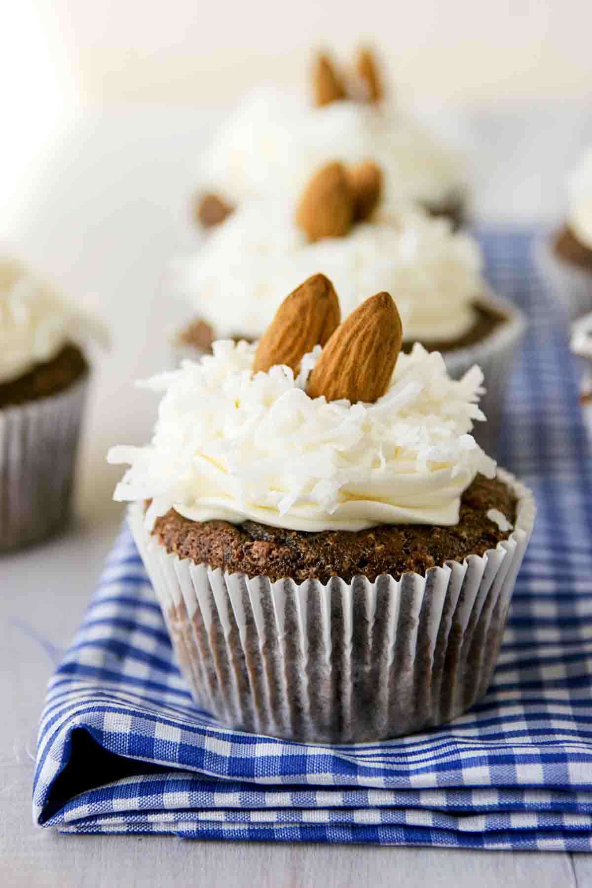 - To decorate the cupcakes, pipe a couple of tablespoons of the frosting on top of each cupcake. If desired, roll the top in coconut and top with almonds.