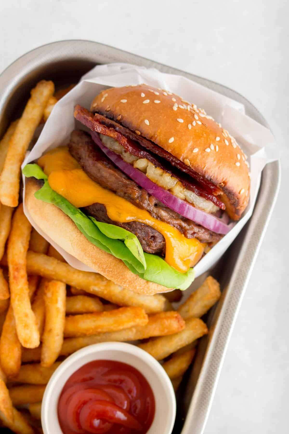 A double patty cheeseburger with grilled pineapple and bacon, this Aloha Burger is sure to steal the show! Paired with a homemade honey mustard sauce, this sweet and savoury burger is a great way to dress up a burger.