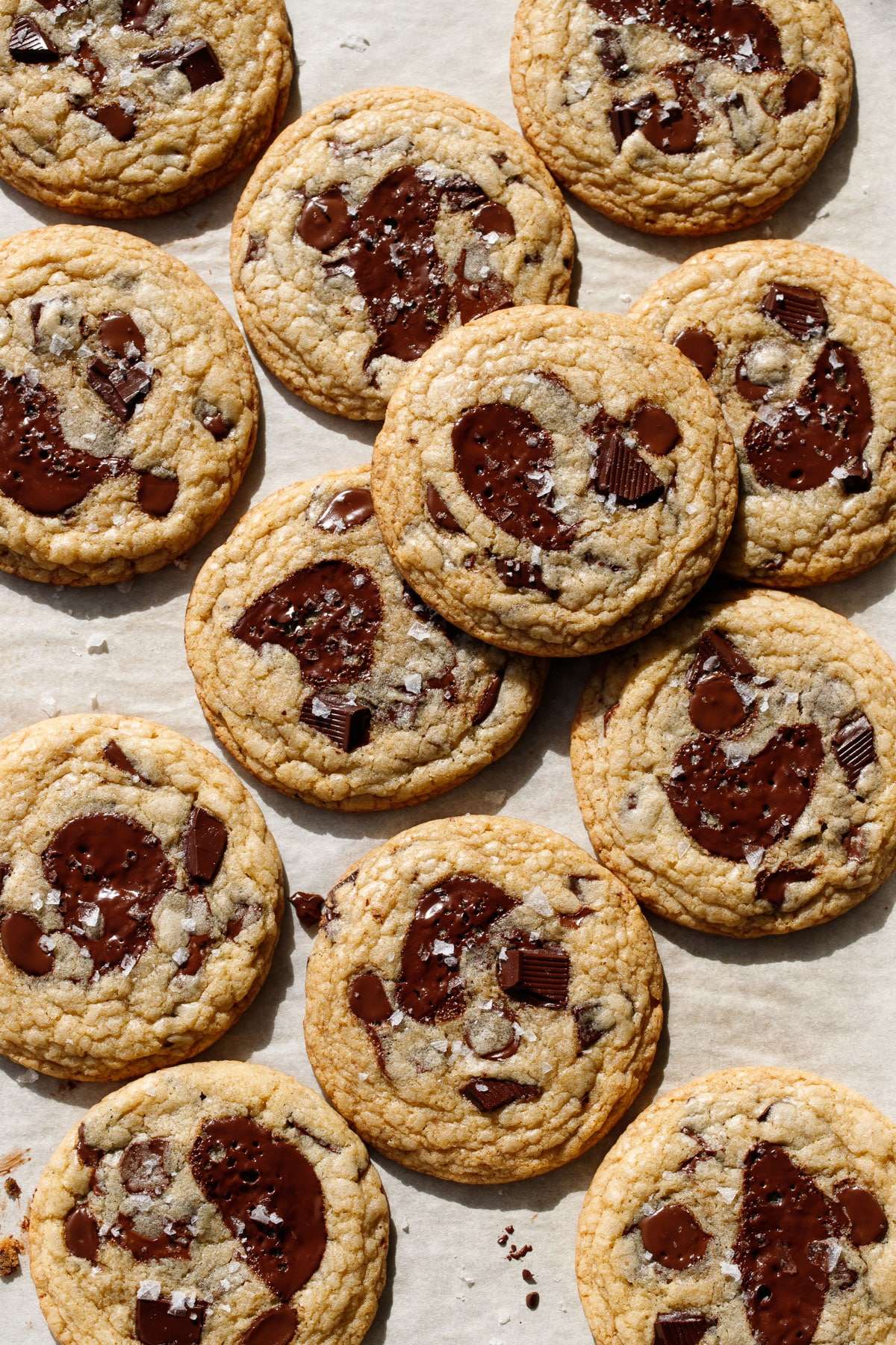 - Bake for 12 to 14 minutes or until tops are puffed and edges are golden brown (if baking from room temperature dough or if you are making smaller cookies you'll only need 9 to 11 minutes or so). Immediately after removing from the oven, swirl a large round cookie cutter around the warm cookies, tucking in the uneven edges to create perfectly circular cookies. Sprinkle with flake sea salt, if desired, while cookies are still warm and melty.