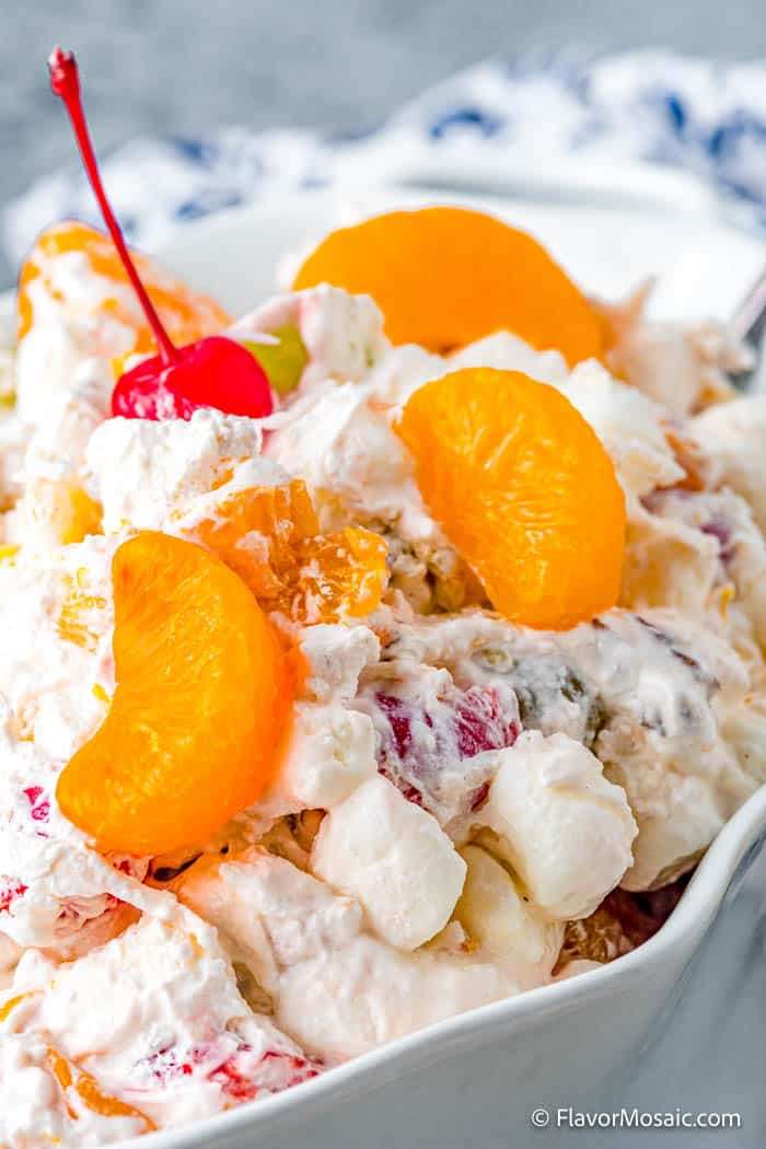 - You can reserve a few mandarin oranges and maraschino cherries to decorate the top of the salad.