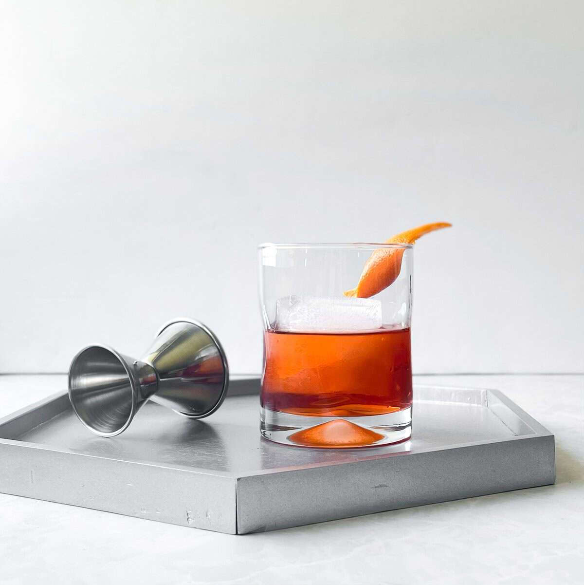 - Strain into a lowball glass with a rocks ice and garnish with the orange slice.