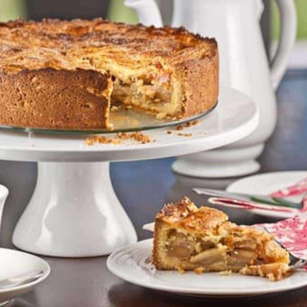 - Preheat the oven to 180 Celsius (355 Fahrenheit) and remove the pastry from the refrigerator and sprinkle the ground almonds over the base which will help prevent the base from becoming too soggy. Pour the drained and cooled apples over the top and then top with the pastry lid. Press the edges of the pastry together to seal and then brush with the egg yolk glaze and sprinkle with extra sugar.