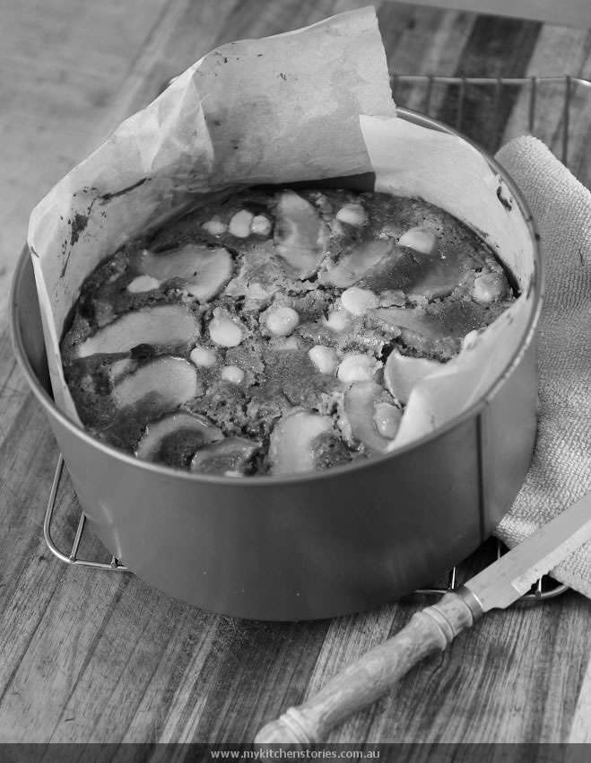 - Spoon into the prepared cake tin and flatten with a spoon. Garnish with sliced apples painted with a little butter sprinkle with the extra nuts and a little raw sugar if you like. ( I do!).