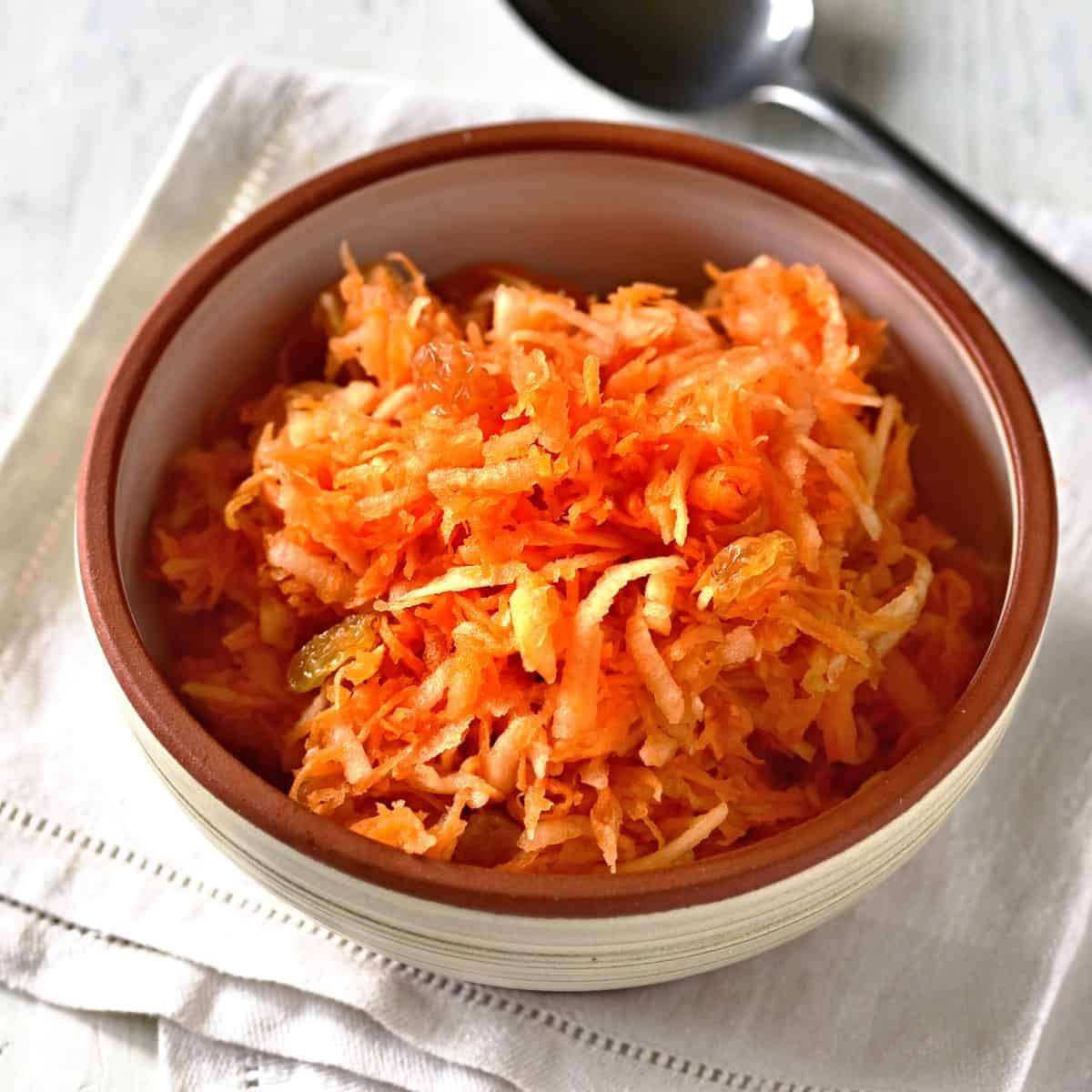 This is a simple and quick sweet salad made from raw shredded carrots and apples, mixed with lemon juice, sugar, and raisins for added flavor. In Czech, it's called mrkvový salát.