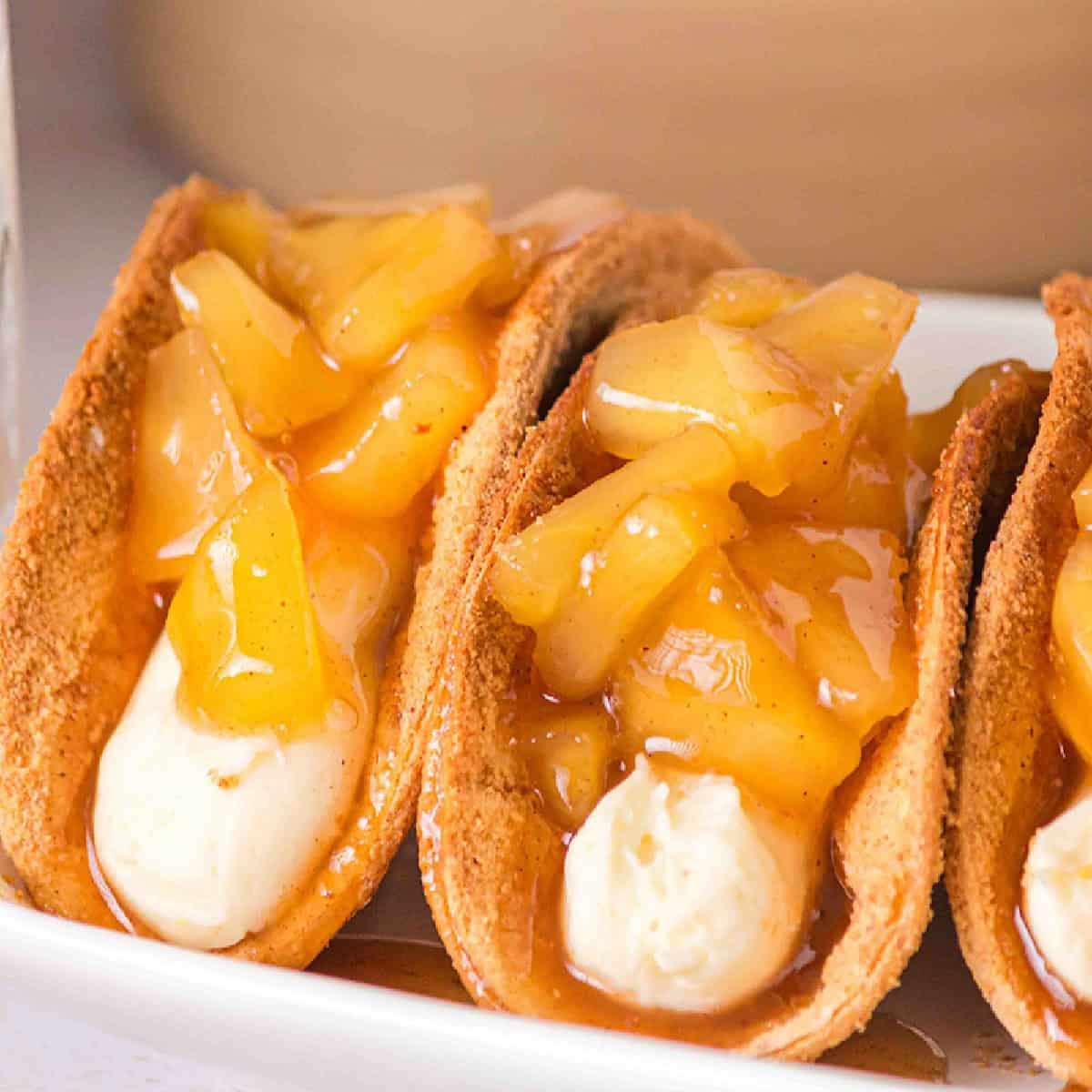 - Storage: If the dessert tacos are assembled, I recommend eating them the day they’re made. If they aren’t assembled, store each component in separate airtight containers. They will last 2 to 3 days keeping the apple pie filling and cheesecake filling in the fridge and the taco shells at room temperature.