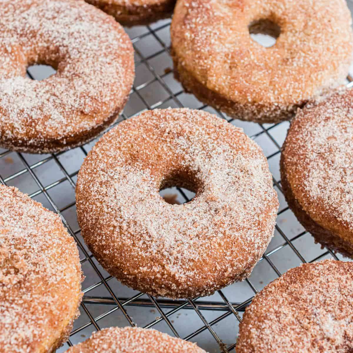 - Dip slightly cooled donuts in the melted butter (coating both sides), then dip in cinnamon sugar mix. Return to wire rack and repeat for remaining donuts. Enjoy warm.