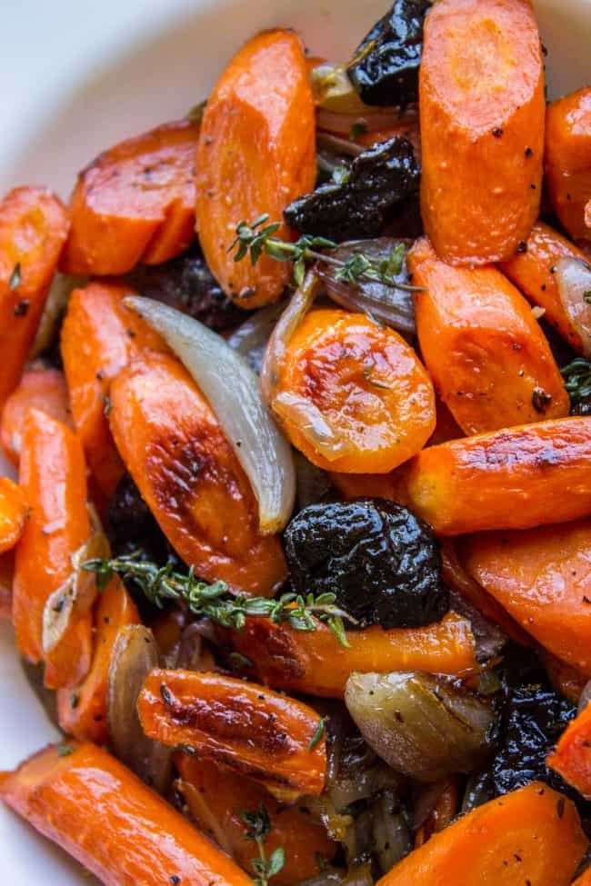 These tender carrots are roasted in apple cider sweetness that gives them an incredible glaze! Halfway through roasting, add a handful of dried plums. It's an awesome combo and perfect with the turkey and gravy on your Thanksgiving plate!