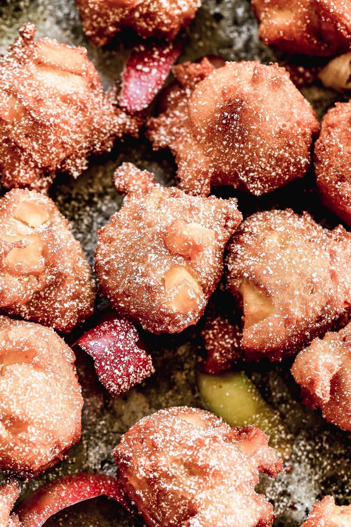- Let the fritters fry until golden brown, about 2-3 minutes. Flip and repeat on the other side. You want them golden brown on all sides. Use a slotted spoon to scoop the fritters out of the oil. Drain on paper towels. Sprinkle with powdered sugar while hot.