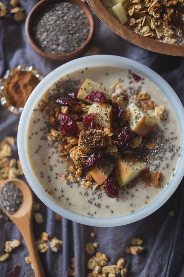 This apple pie smoothie bowl tastes just like apple pie without all the calories found in the traditional dessert. It's topped with fresh-cut apples, apple pie spice, granola, chia seeds, and dried cranberries. This is the perfect way to start your day!