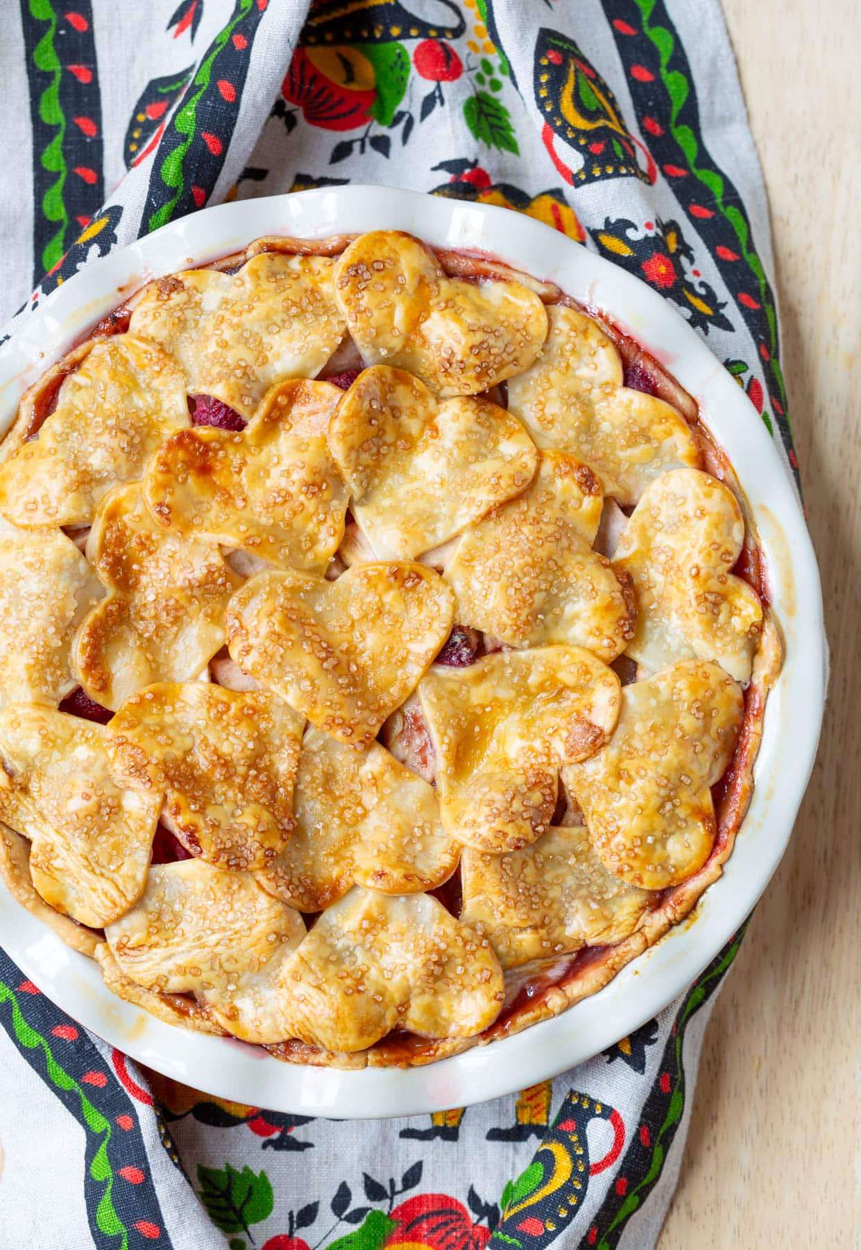 - Roll out the second pie crust and use a cookie cutter to cut fun shapes for the top crust. (I used a heart cookie cutter.) Lay the pie crust shapes over the filling, overlapping on the edges. Then whisk the egg and water to create an eggwash. Brush the eggwash over the top of the pie crust, then sprinkle the top of the crust with coarse Demerara sugar.