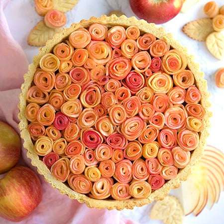 - Roll the slices into a rose shape. Place on the tart and arrange petals to your preference.
