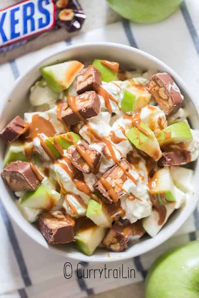 - Once it had chilled, scoop salad into serving dish, top with few chopped apples and snicker pieces and then drizzle with caramel sauce. Enjoy as dessert or if you like sweet sides serve it as side dish.