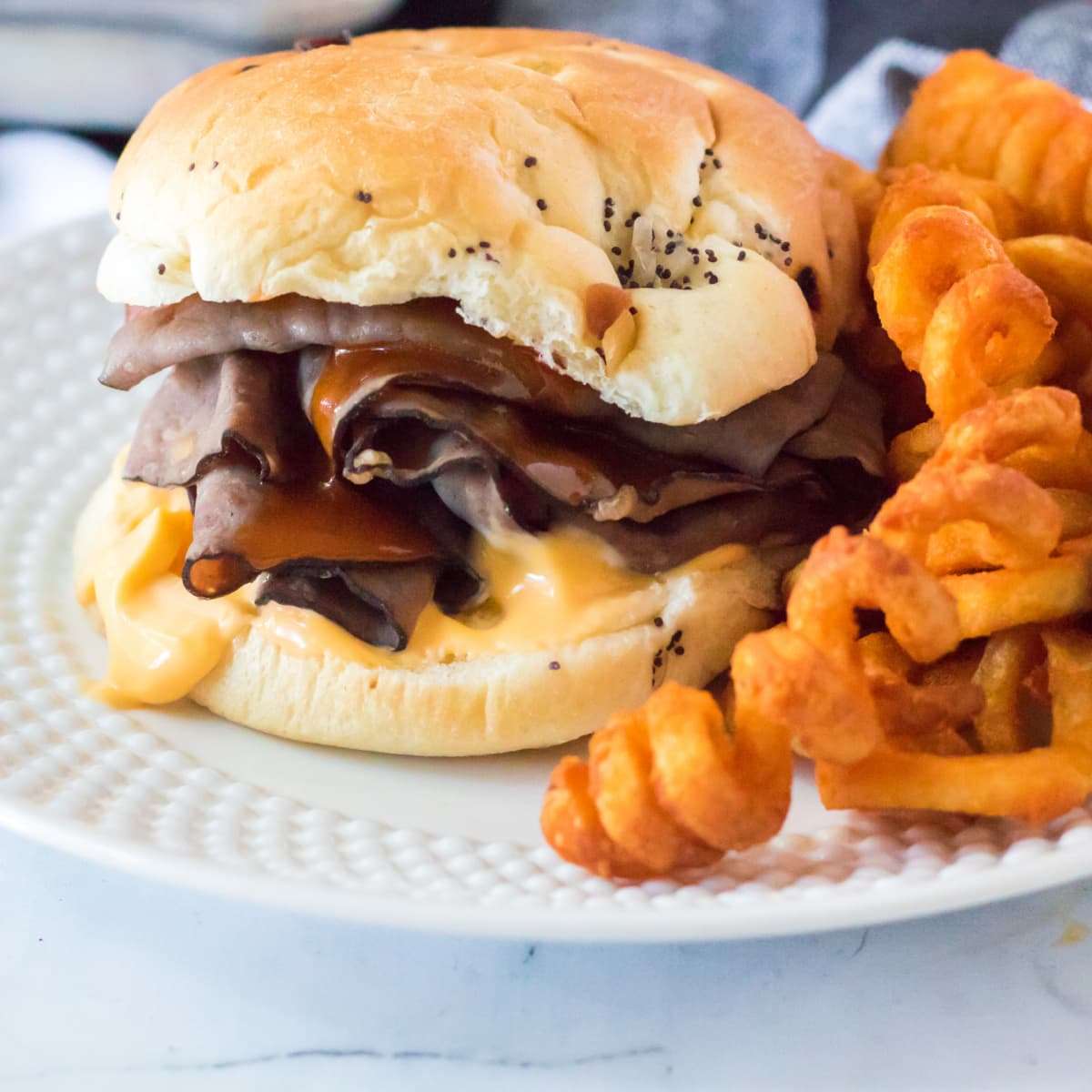 This Arby's Beef and Cheddar is a meaty roast beef sandwich with melted cheddar cheese sauce on an onion bun.