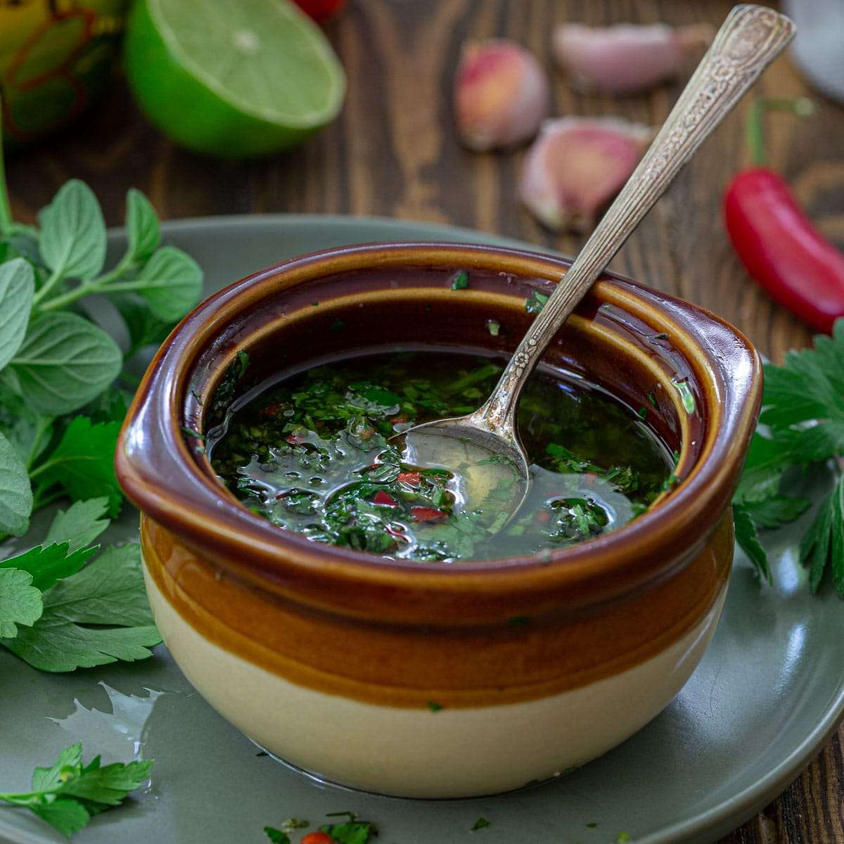 Argentinian Chimichurri is zesty, herby and garlicky, making it the perfect sauce to serve with grilled meat! A staple of South American cuisine, this recipe is easy to make and ready in less than 5 minutes.