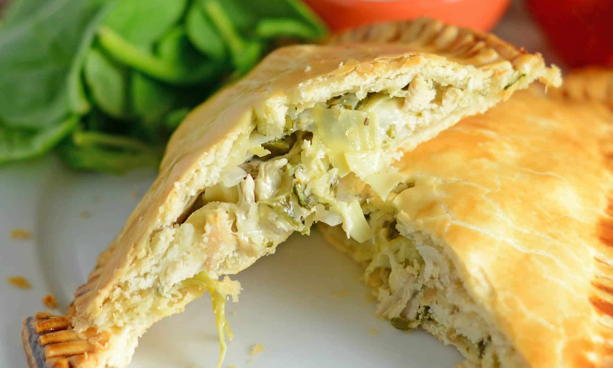 Artichoke Chicken Pot Pie is an easy hand pie recipe stuffed with shredded chicken, artichokes, spinach, red onion, cheese and zesty Italian dressing.