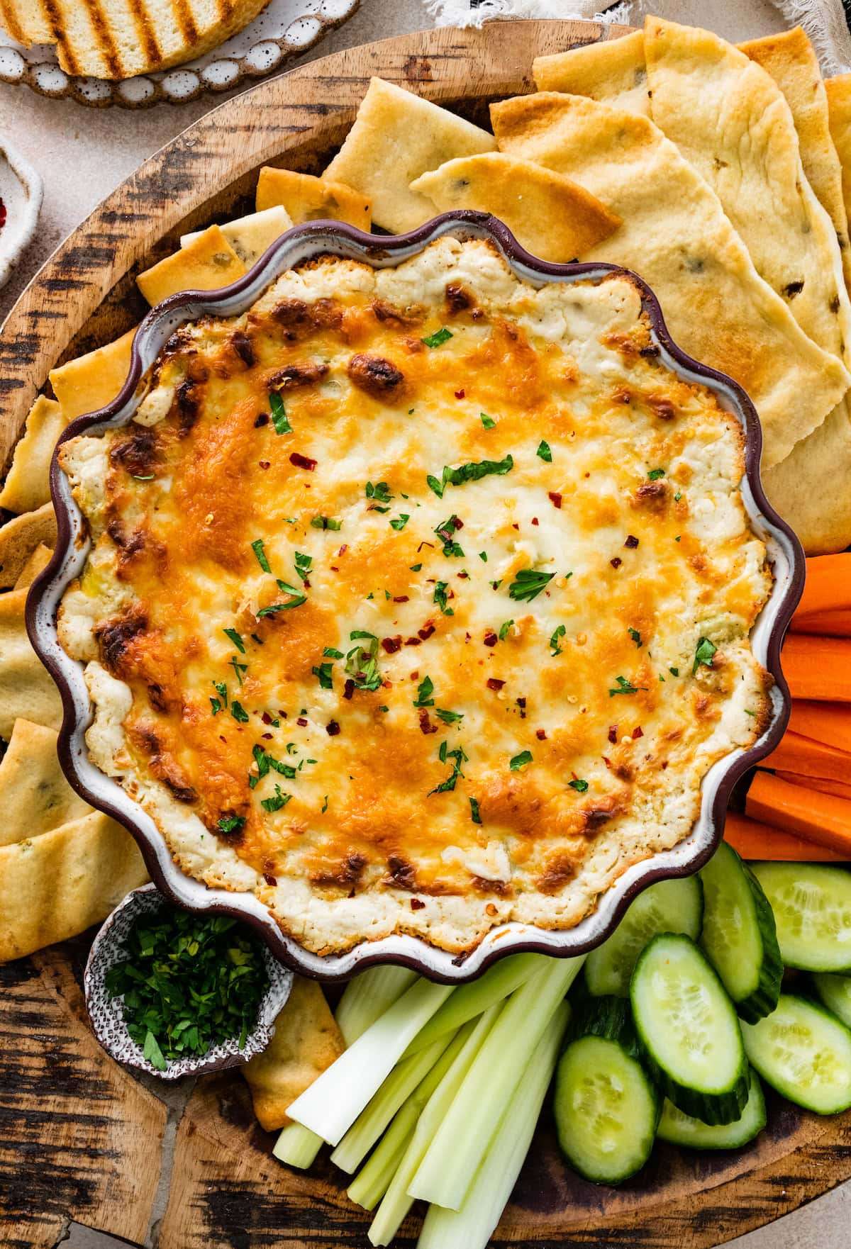 - Serve warm with crackers, chips, cut up vegetables, crostini, etc.