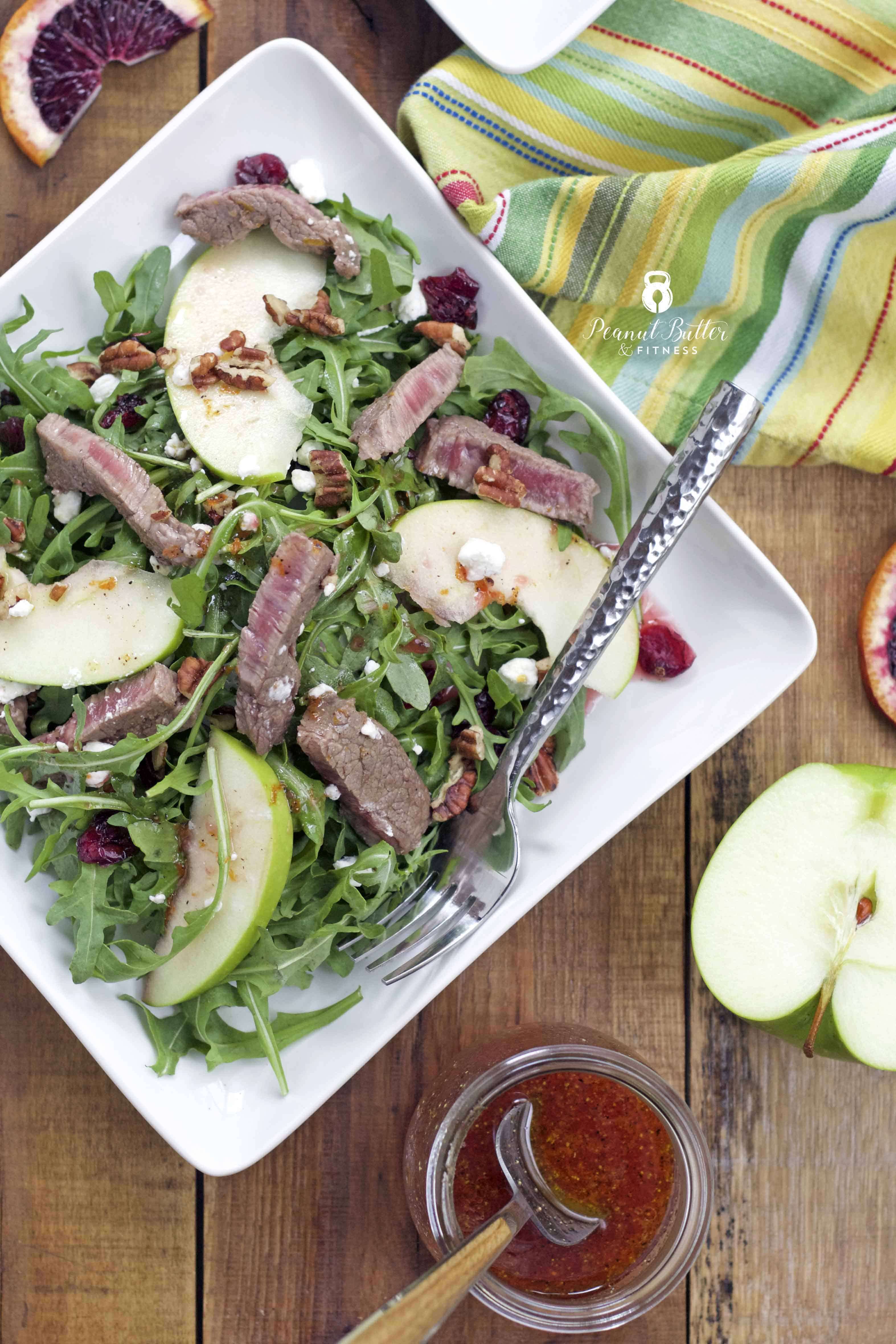 - Assemble arugula, sliced green apple, dried cranberries, pecans and goat cheese in serving dish.