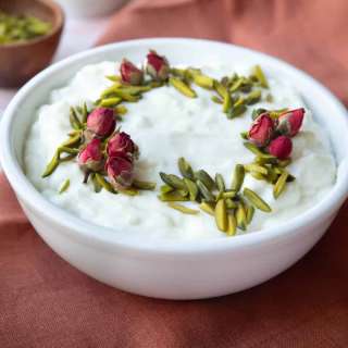 - Servir l’ashta arrosé d'ater et saupoudré de pistaches torréfiées.
