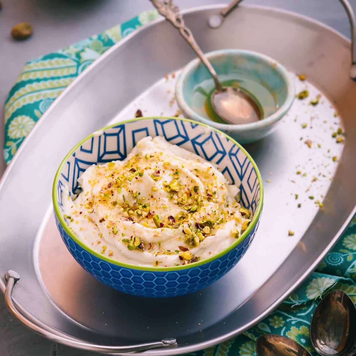 - Servir el ashta rociado con agua y espolvoreado con pistachos tostados.